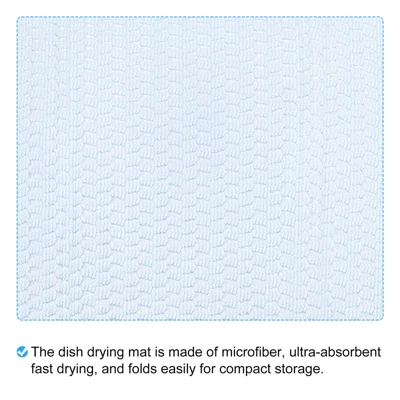 The dish drying mat is crafted from absorbent microfiber, ensuring no fading or odors while keeping countertops dry. Its foldable design allows for easy storage in drawers or cabinets without occupying much space. The mat’s water absorption feature helps maintain a tidy kitchen counter and safeguards the tabletop and glassware. It serves multiple functions, such as draining water, acting as a heat insulation pad, or even being used as a pet mat, provided it is cleaned and dried post-use. The mat is easy to care for, with hand wash instructions available. Measuring approximately 15.75 x 11.82 inches, it comes in blue, is suitable for various kitchen uses, and includes two pieces in the package.