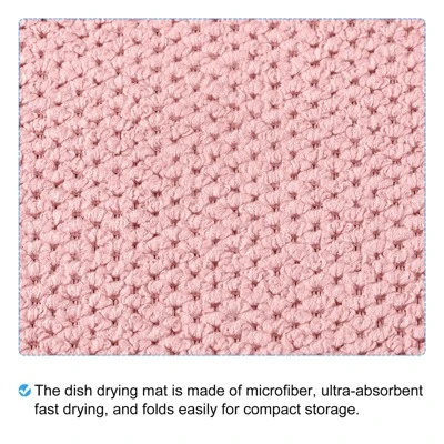 The dish drying mat is crafted from microfiber, ensuring ultra-absorbency and fast drying. Its compact design allows easy folding for storage. It can be hung up or stored in a drawer, making it convenient for repeated use. Ideal for drying glassware, hot pots, and dishes, this mat is versatile and can be used with a dish rack or as a table placemat. Hand washing is recommended for care. The mat is suitable for use as a dish drying pad, heat insulation pad, or dog feeding mat.
