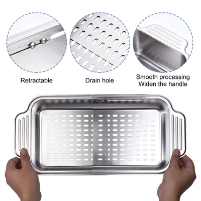 This strainer is made of 304 stainless steel, which is a friendly and odorless material with good heat resistance. You can safely strain hot and cold foods with it. It has multiple uses such as draining foods, rinsing fruits and vegetables, and drying dishes. The double-handle hole design makes it convenient and labor-saving to use, and you can easily put it over the sink or hang it on the kitchen wall. Its extendable design can be adjusted to fit your different needs and different kitchen sinks.