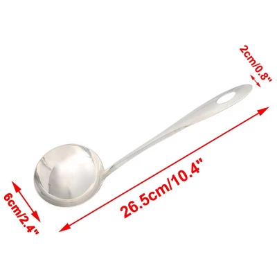 These soup ladles are highly durable and resistant to cracking and deformation, making them suitable for use in restaurants, food shops, and catering halls. They are gentle on delicate pots and nonstick pans, allowing you to scrape up food without scratching the surface. Made from stainless steel, these spoons are stylish and versatile, perfect for mixing, stirring, and cooking. The long handle is ideal for chefs working in dining halls and messes, providing safety and comfort when handling hot liquids. Easy to clean and a great addition to any kitchen.